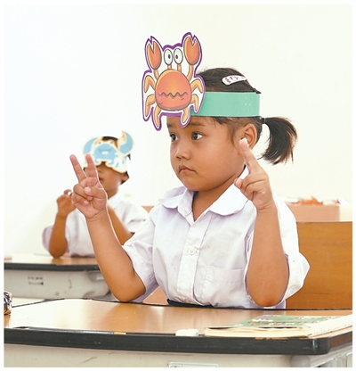 在老挝首都万象北郊,路旁一座红顶白色建筑前的空地上,几名儿童正在玩耍。这里是一所民办特殊学校——“希望之手”听障儿童学校。教室内,男孩阔康·西本恒用蜡笔在纸上涂出一轮红日,又在旁边画出两个牵手的小人。放下画笔,阔康把这幅画送给了身旁的中国志愿者。