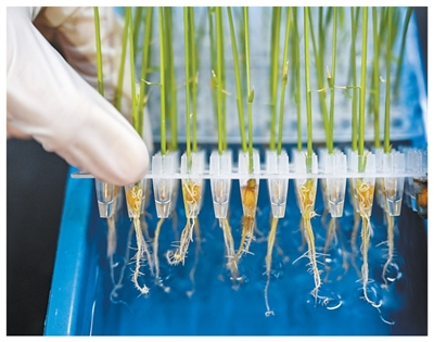 安徽合肥,科研人员观察水稻水培幼苗根系长势。 |
