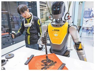 湖北武汉,人形机器人跟着训练师练习写字。 |