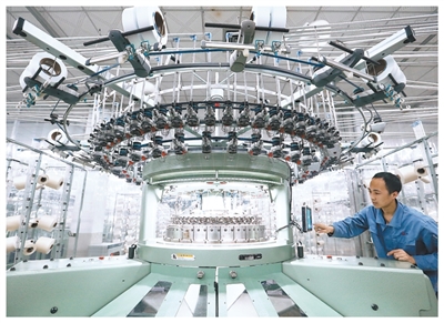 山东青岛,纺织服装企业的技术工人利用数字化设备生产坯布。 |