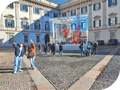 米兰市民与游客在冬奥会倒计时装置前拍照合影。 |