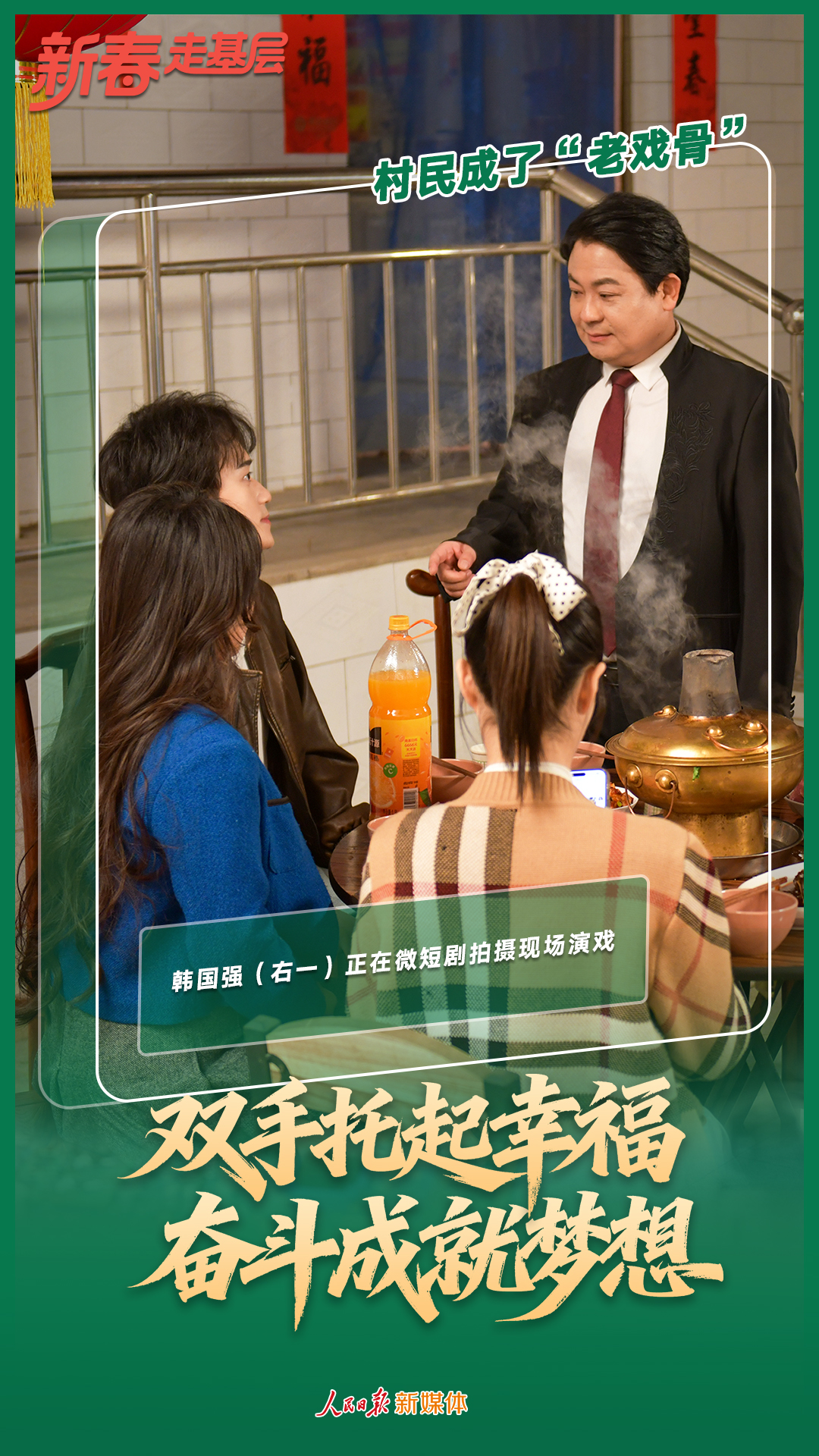 山西临汾市尧都区一户农家小院里,42岁的村民韩国强一身西装,梳着大背头,对着镜头中气十足地说台词。这里正在拍摄一场微短剧的新春戏,他扮演男主角的父亲。