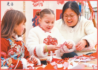 1月24日,安徽黄山市屯溪区南溪南村,外国小朋友体验非遗剪纸。 |