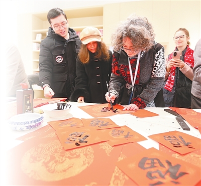 1月23日,山东日照市山东外国语职业技术大学,外籍教师学习用毛笔书写“福”字。 |