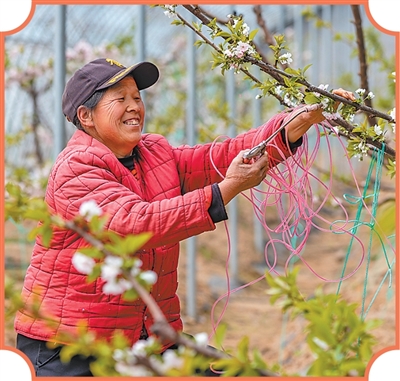 山西省运城市平陆县的现代农业采摘园内,果农对樱桃树进行授粉作业。 权永军摄(影像中国) |