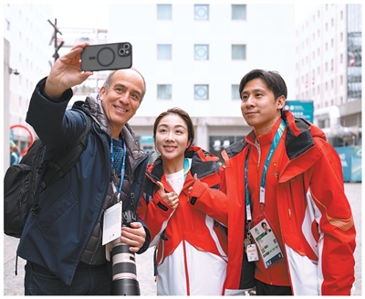 当地时间2月3日,在意大利米兰奥运村,一名记者(左一)与中国花滑队运动员自拍留念。 |