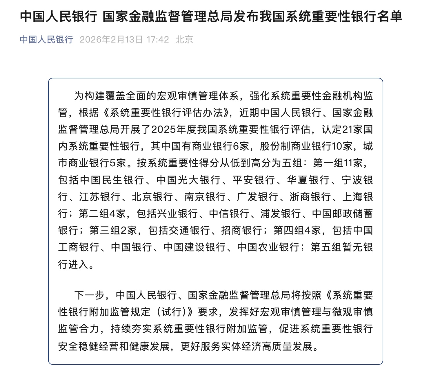 为构建覆盖全面的宏观审慎管理体系,强化系统重要性金融机构监管,根据《系统重要性银行评估办法》,近期中国人民银行、国家金融监督管理总局开展了2025年度我国系统重要性银行评估,认定21家国内系统重要性银行,其中国有商业银行6家,股份制商业银行10家,城市商业银行5家。按系统重要性得分从低到高分为五组:第一组11家,包括中国民生银行、中国光大银行、平安银行、华夏银行、宁波银行、江苏银行、北京银行、南京银行、广发银行、浙商银行、上海银行;第二组4家,包括兴业银行、中信银行、浦发银行、中国邮政储蓄银行;第三组2家,包括交通银行、招商银行;第四组4家,包括中国工商银行、中国银行、中国建设银行、中国农业银行;第五组暂无银行进入。