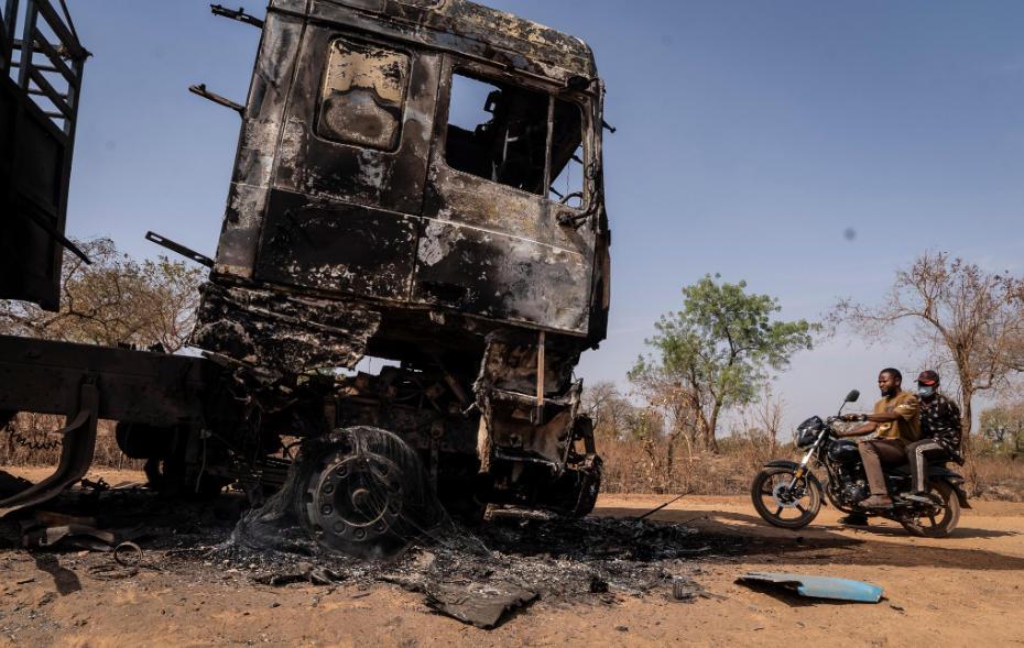 △尼日利亚夸拉州恐袭事件发生后,一辆被焚烧的卡车残骸。