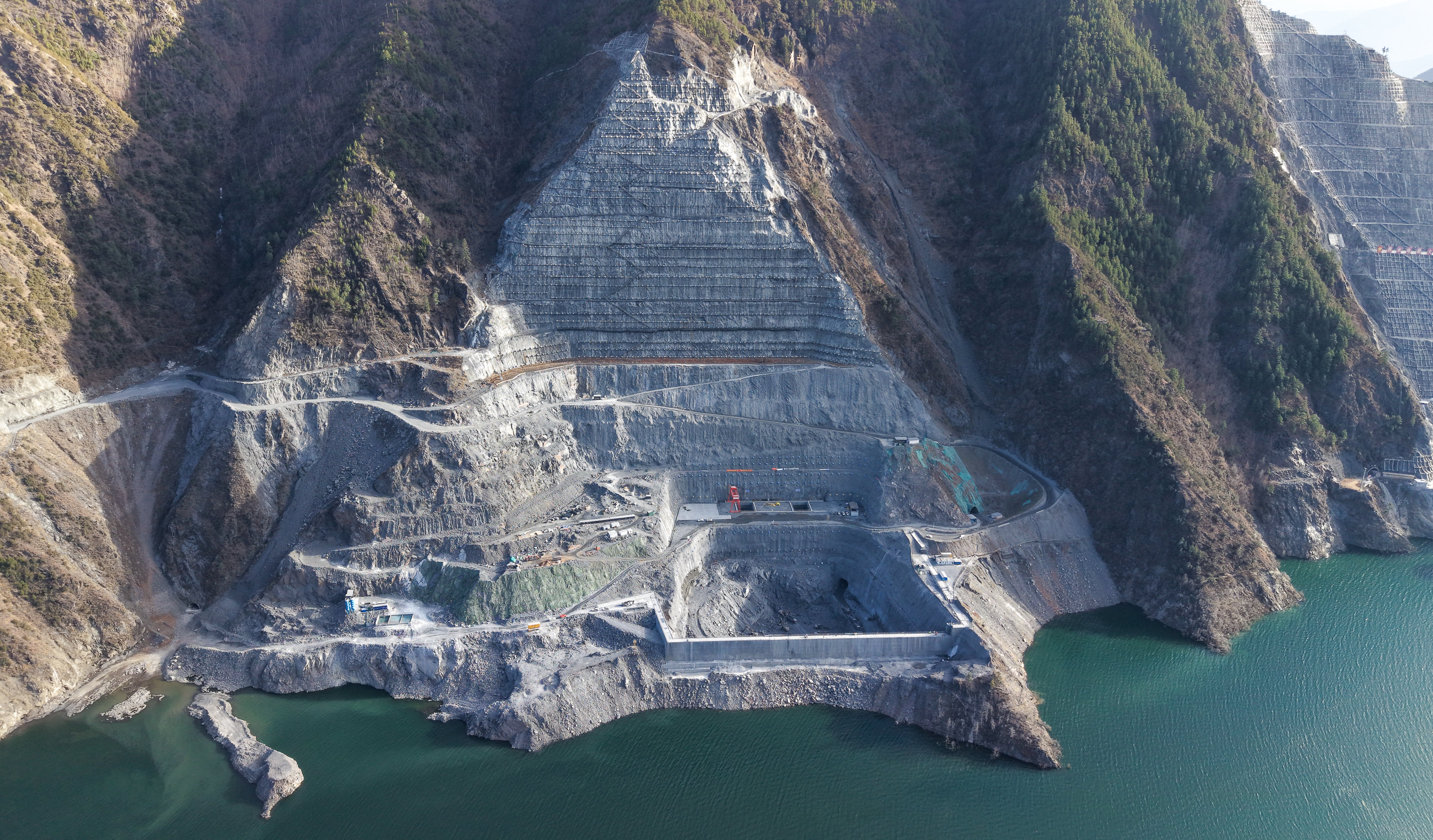 为破解这一难题,建设团队为混凝土打造了一个恒温恒湿的“成长环境”:优化混凝土配合比,从内部提升抗冻耐久性能,如同为其穿上“保暖内衣”;构建全流程温控防线,对骨料加热、拌合控温、运输保温、入仓振捣后的覆盖养护等环节层层把关;创新采用蒸汽养护法,在户外搭建“恒温恒湿养护室”,确保刚浇筑的混凝土在温暖湿润环境中平稳度过“成长期”,有效规避温差裂缝风险。春节期间,600余名建设者坚守现场,如期启动大坝首仓混凝土浇筑,标志着电站正式迈入主体工程施工新阶段。