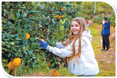 便利政策叠加特色体验,让“沉浸式”体验消费逐渐成为“中国购”新热点。图为在江西省赣州市的一家脐橙种植基地,外国游客体验采摘赣南脐橙。朱海鹏摄(人民视觉)