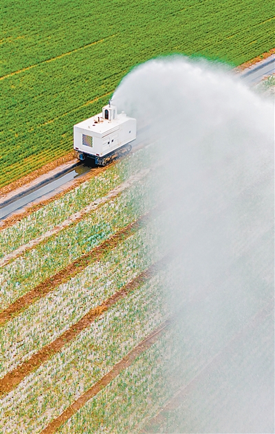 图为2月24日,在河南省商丘市睢县后台乡一处农田内,无人智能灌溉机器人正在进行水肥一体化喷灌作业。