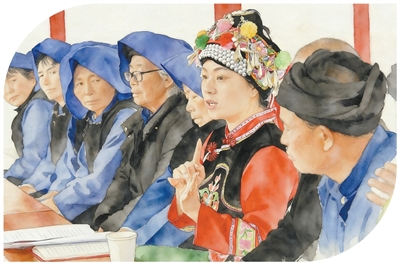 全国人大代表、云南省大理白族自治州南涧彝族自治县碧溪乡凤仙村村民鲁丽华(右三)在南涧彝族自治县无量山镇新政村宣讲全国两会精神。 |