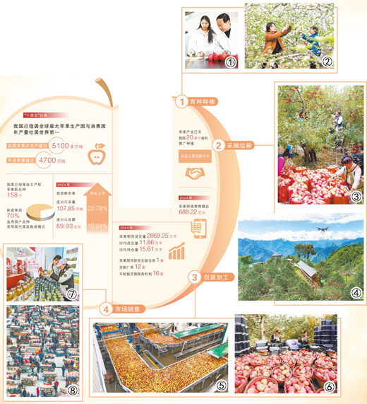图①:在陕西白水县,西北农林科技大学白水苹果试验站站长高华(右)和硕士研究生于萌正在检测苹果糖度。 新华社记者 李一博摄 图②:在山西临汾市襄汾县西贾乡三盛村,果农对苹果园进行疏花作业。 李现俊摄(影像中国) 图③:四川茂县南新镇安乡村村民在采摘苹果。 兰红光摄(新华社发) 图④:在湖北恩施土家族苗族自治州巴东县沿渡河镇小神农架村骄顶寨高山苹果种植基地,无人机在空中吊运采摘的苹果。 焦国斌摄(人民视觉) 图⑤:贵州威宁彝族回族苗族自治县产投生态果业有限公司,工人正在自动化设备生产线上操控设备,对苹果进行清洗、测色、分级。 罗喜贵摄(影像中国) 图⑥:新疆阿克苏地区阿瓦提县塔木托格拉克镇吐格贝希村的果园里,果农正忙着分拣、包装“冰糖心”苹果。 包良廷摄(影像中国) 图⑦:在甘肃平凉举行的2025年中国苹果产销峰会暨静宁苹果招商推介大会上,市民游客参观并拍照。 郑 兵摄(影像中国) 图⑧:山东招远市毕郭苹果批发市场,交易火爆。 乔光先摄(影像中国) 数据来源:中国苹果产业协会、国家苹果产业技术体系《中国苹果产业发展报告》 |