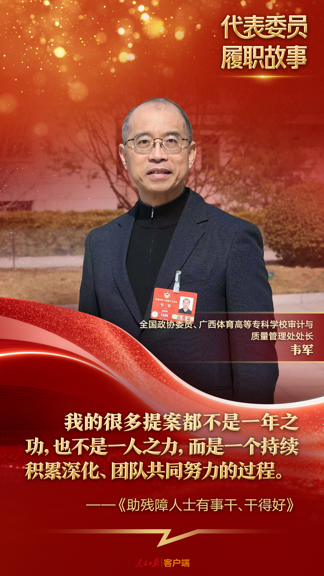 “我的很多提案都不是一年之功,也不是一人之力,而是一个持续积累深化、团队共同努力的过程。”随着调研的深入,韦军发现残障人士就业涉及残联、人社、教育、民政等多个部门。要解决问题,既要转变大家的传统观念,也要推动各部门协同发力。为此,韦军在提案中提出建立跨部门联席会议制度、信息共享平台等机制性建议,推动政策制度协同。