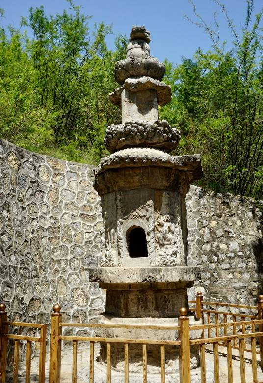 寺外西南十几米处静立着一座七宝塔,据考证为五代后周显德元年(954年)所建。此塔呈八角形平面,高约6米,由双层基座、塔身、塔刹三部分组成,塔身之上莲花、狮子、麒麟、飞马、伎乐人、蛟龙等元素栩栩如生,颇具观赏价值。