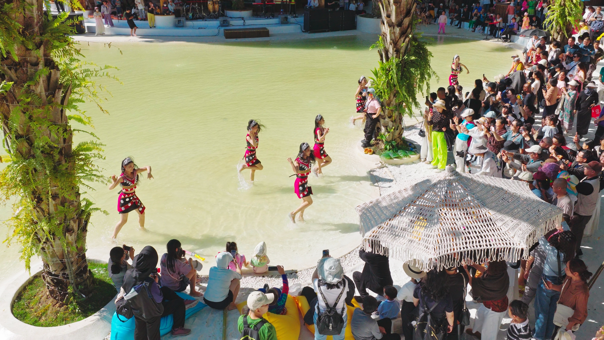 游客在西双版纳州热带花卉园欣赏民族特色表演。