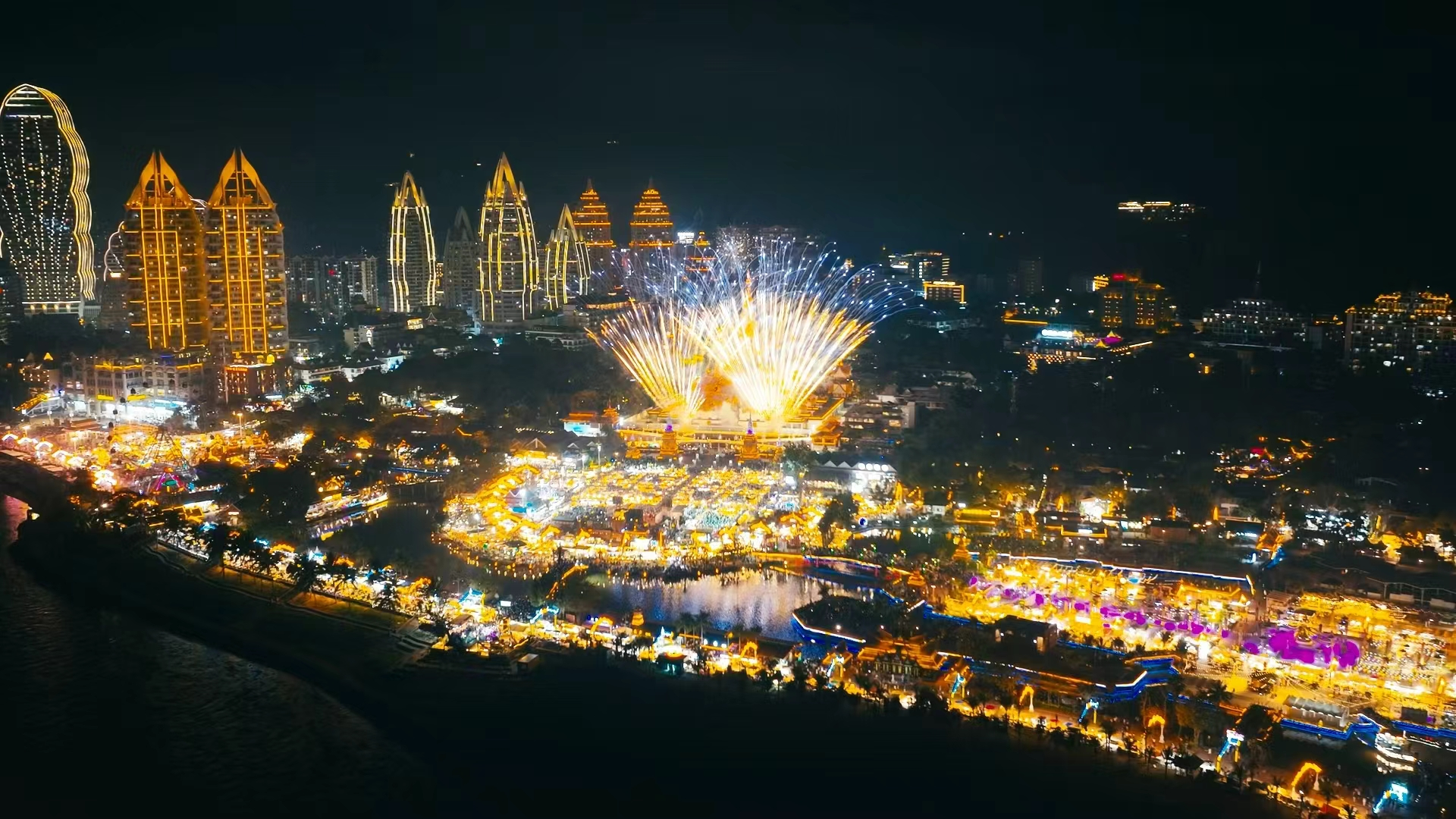 春节期间,景洪市星光夜市举行烟火秀。