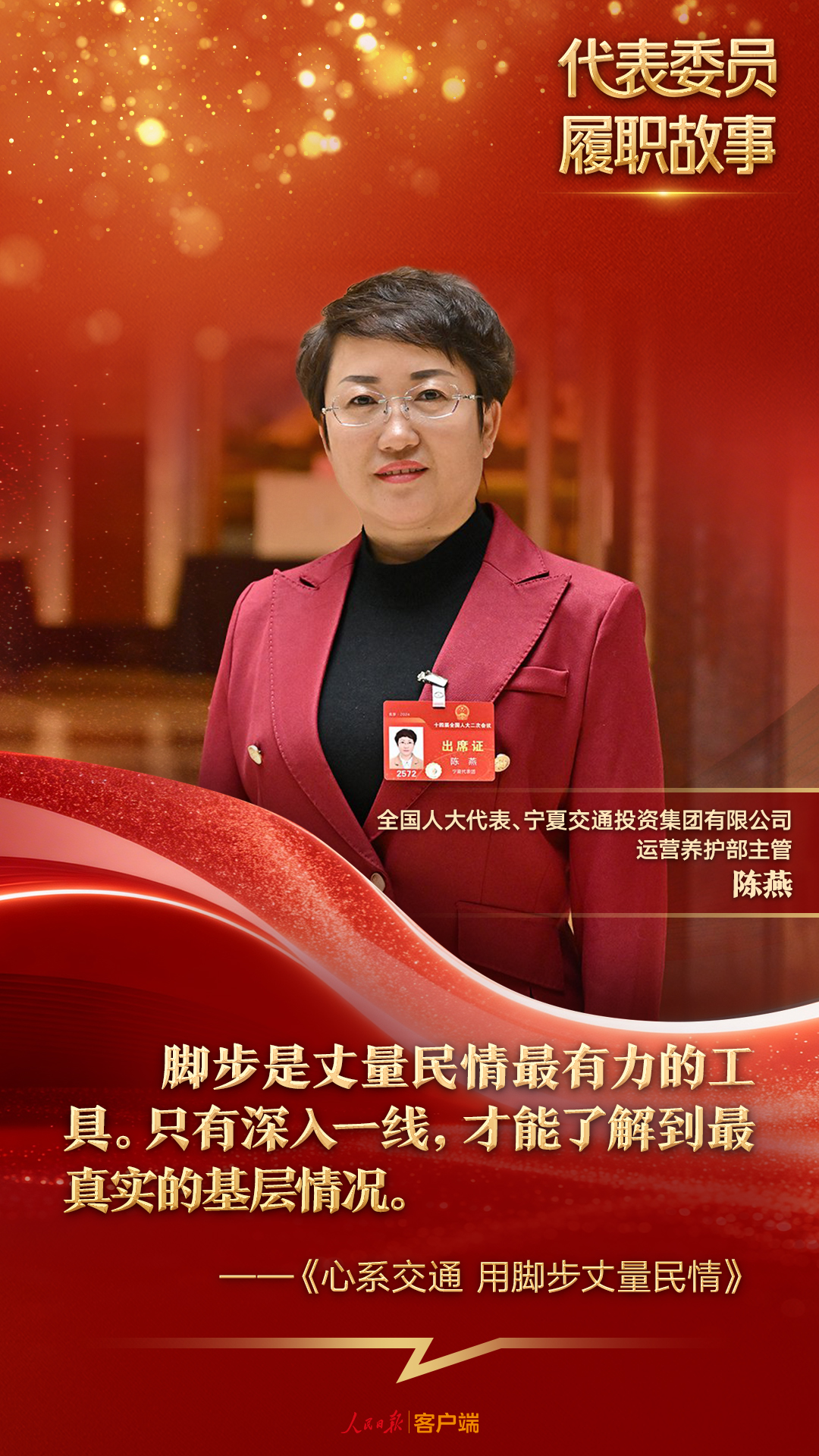 来自交通行业的她,带着专业素养和人文情怀,将群众的需求和国家的交通战略目标融合在一起。她笃定的脚步中,走出了群众的获得感和幸福感,也走出了人大代表的职责与担当。脚下沾的泥越多,离群众就越近;肩上扛的责任越实,履职就越有分量。