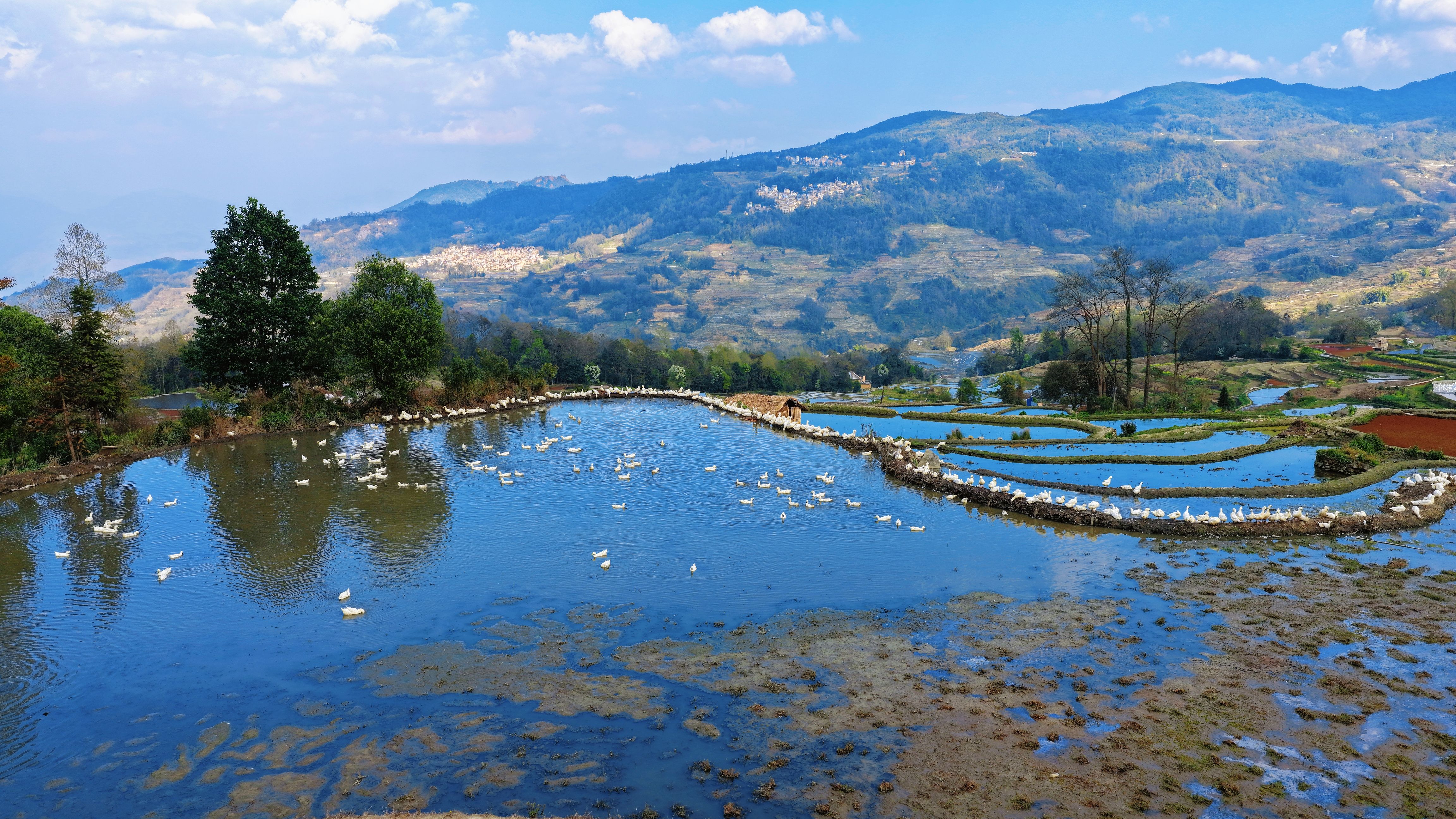 最引人注目的,是梯田畔那一片片盛开的油菜花。金黄的花田映着粼粼水光,远远望去,犹如给大地铺上了一层会发光的碎金。