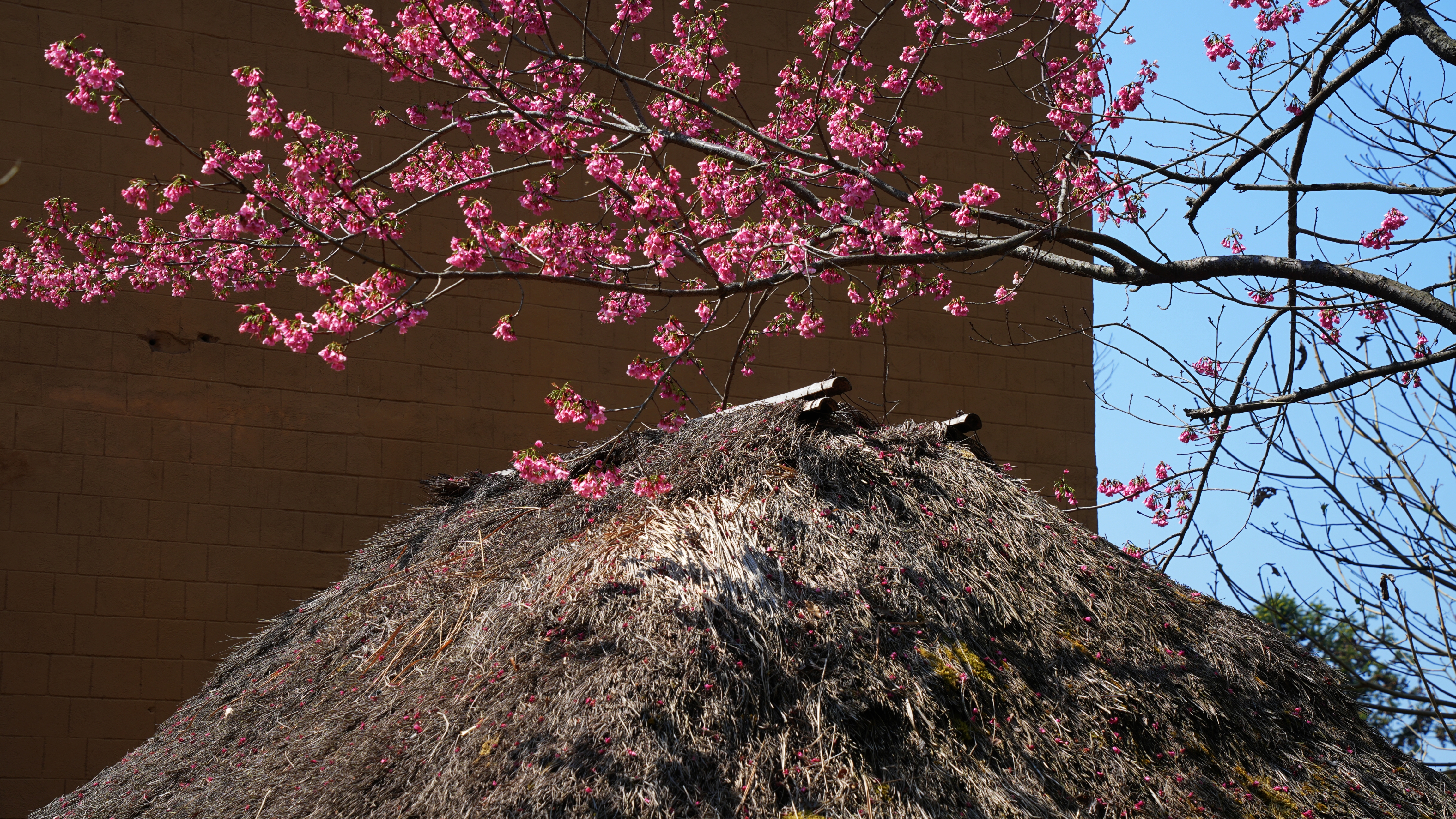 房前屋后,一树树樱花灿若云霞,粉嫩的花瓣随风轻摇,落在茅草屋顶,宛如古诗中的画面。