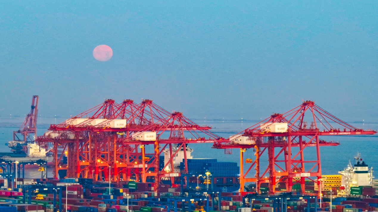 上图:江苏省连云港新东方国际货柜码头上空,一轮红色的圆月低悬于港口塔吊与集装箱堆场之上。(李佳/人民视觉)