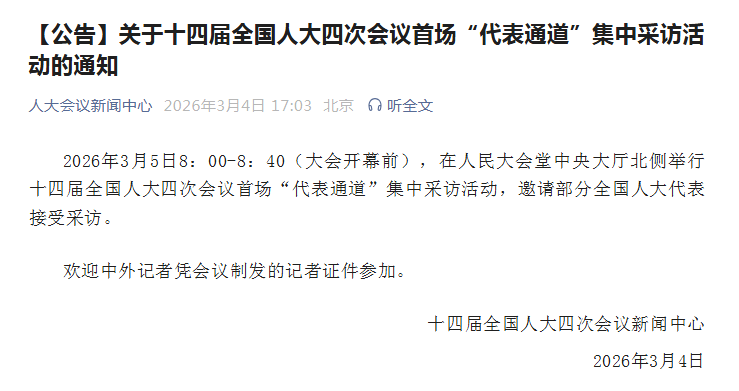 十四届全国人大四次会议新闻中心发布通知,2026年3月5日8:00-8:40(大会开幕前),在人民大会堂中央大厅北侧举行十四届全国人大四次会议首场“代表通道”集中采访活动,邀请部分全国人大代表接受采访。欢迎中外记者凭会议制发的记者证件参加。