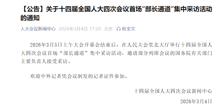 十四届全国人大四次会议新闻中心发布通知,2026年3月5日上午大会开幕会结束后,在人民大会堂北大厅举行十四届全国人大四次会议首场“部长通道”集中采访活动,邀请部分列席会议的国务院有关部门主要负责人接受采访。欢迎中外记者凭会议制发的记者证件参加。