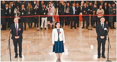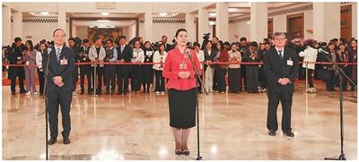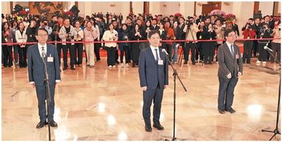蒋鹏举委员(左)、黄三文委员(中)、潘建伟委员在接受媒体采访。本报记者 张武军摄