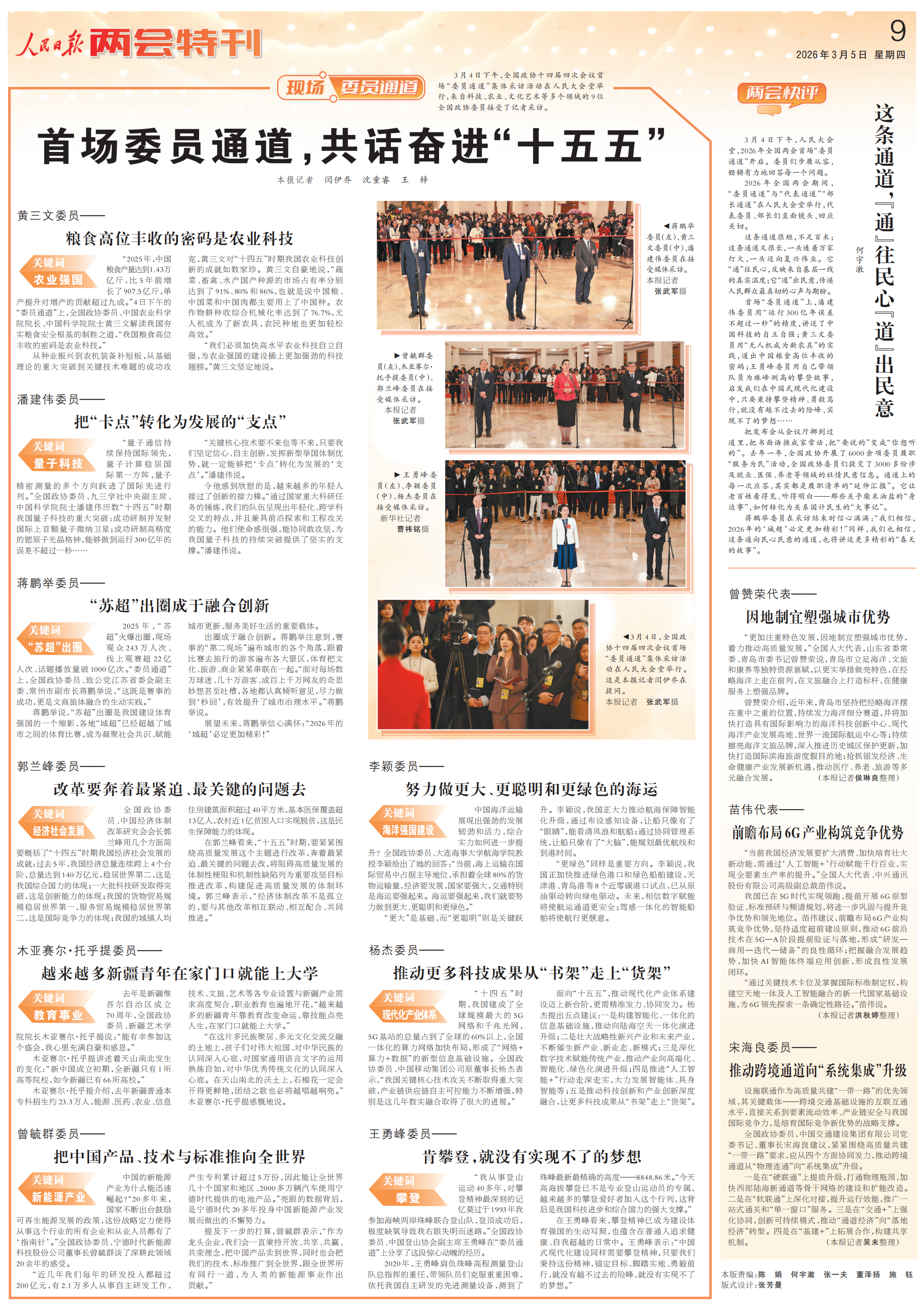 3月4日下午,全国政协十四届四次会议首场“委员通道”集体采访活动在人民大会堂举行,来自科技、农业、文化艺术等多个领域的9位全国政协委员接受了记者采访。