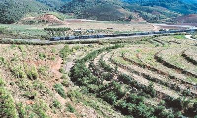 野生亚洲象在云南省西双版纳傣族自治州大渡岗乡活动,中老铁路货物列车限速通行。