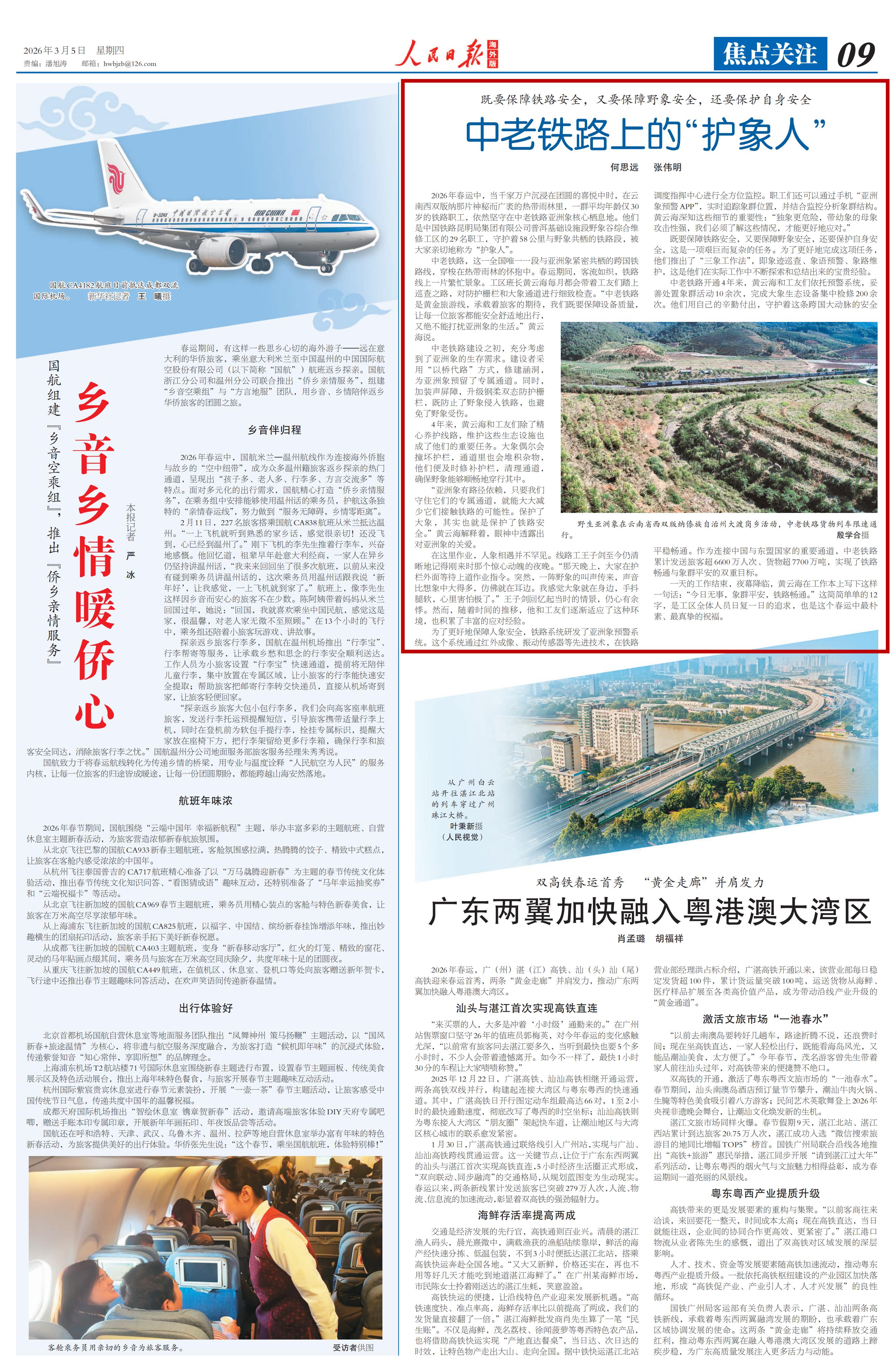 中老铁路,这一全国唯一一段与亚洲象紧密共栖的跨国铁路线,穿梭在热带雨林的怀抱中。春运期间,客流如织,铁路线上一片繁忙景象。工区班长黄云海每月都会带着工友们踏上巡查之路,对防护栅栏和大象通道进行细致检查。“中老铁路是黄金旅游线,承载着旅客的期待,我们既要保障设备质量,让每一位旅客都能安全舒适地出行,又绝不能打扰亚洲象的生活。”黄云海说。