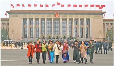 3月7日,全国政协十四届四次会议第二次全体会议开始前,女委员在人民大会堂东门外合影。 |