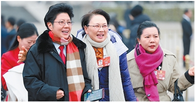 3月5日,十四届全国人大四次会议开幕会结束后,女代表走出会场。 |