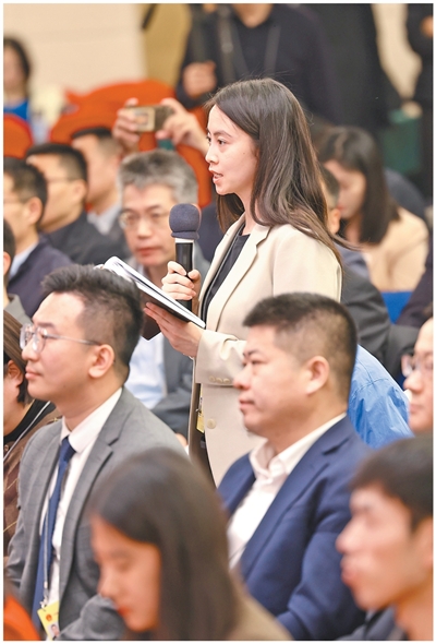 3月7日,十四届全国人大四次会议民生主题记者会上,一名女记者正在提问。 |