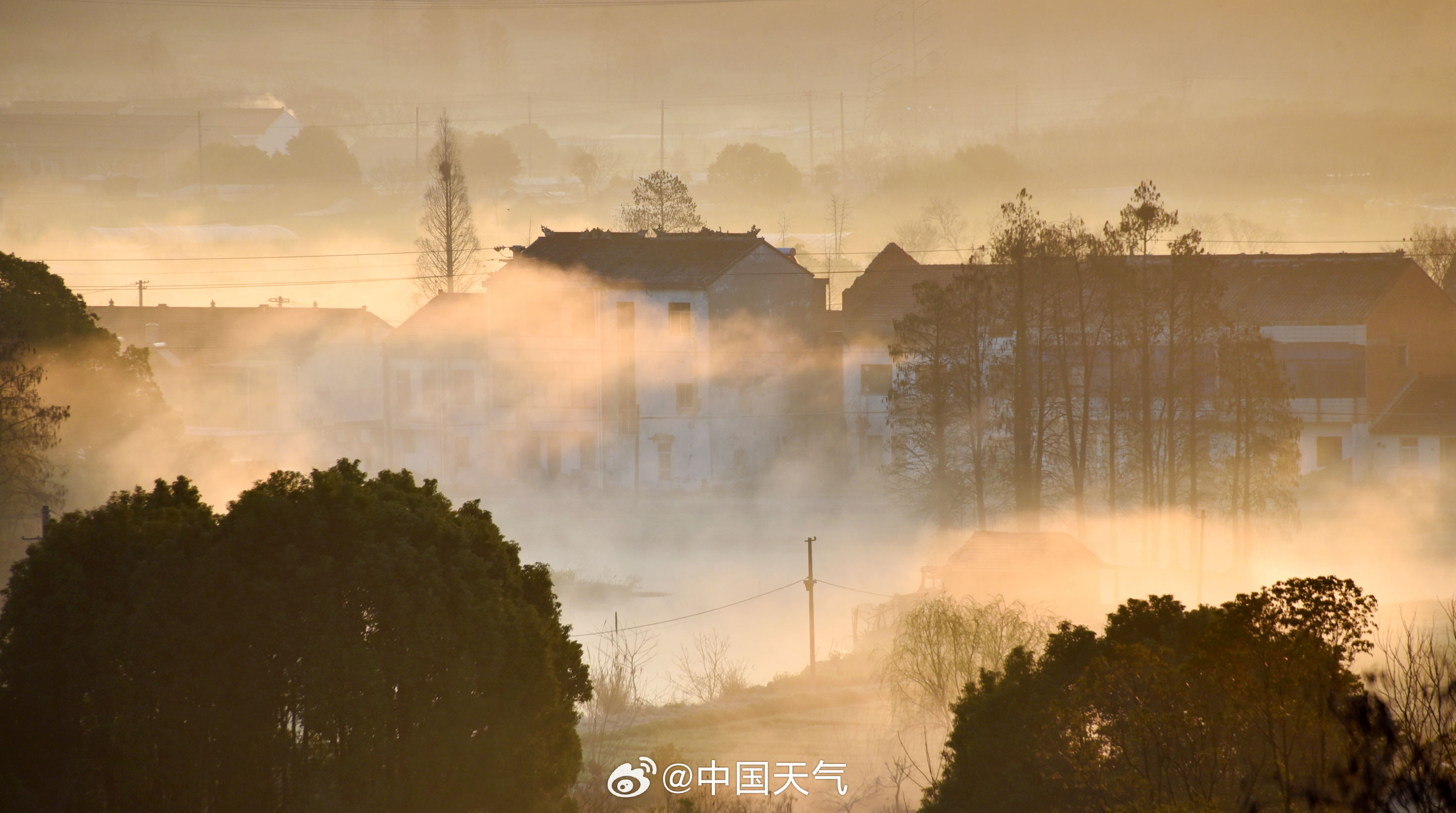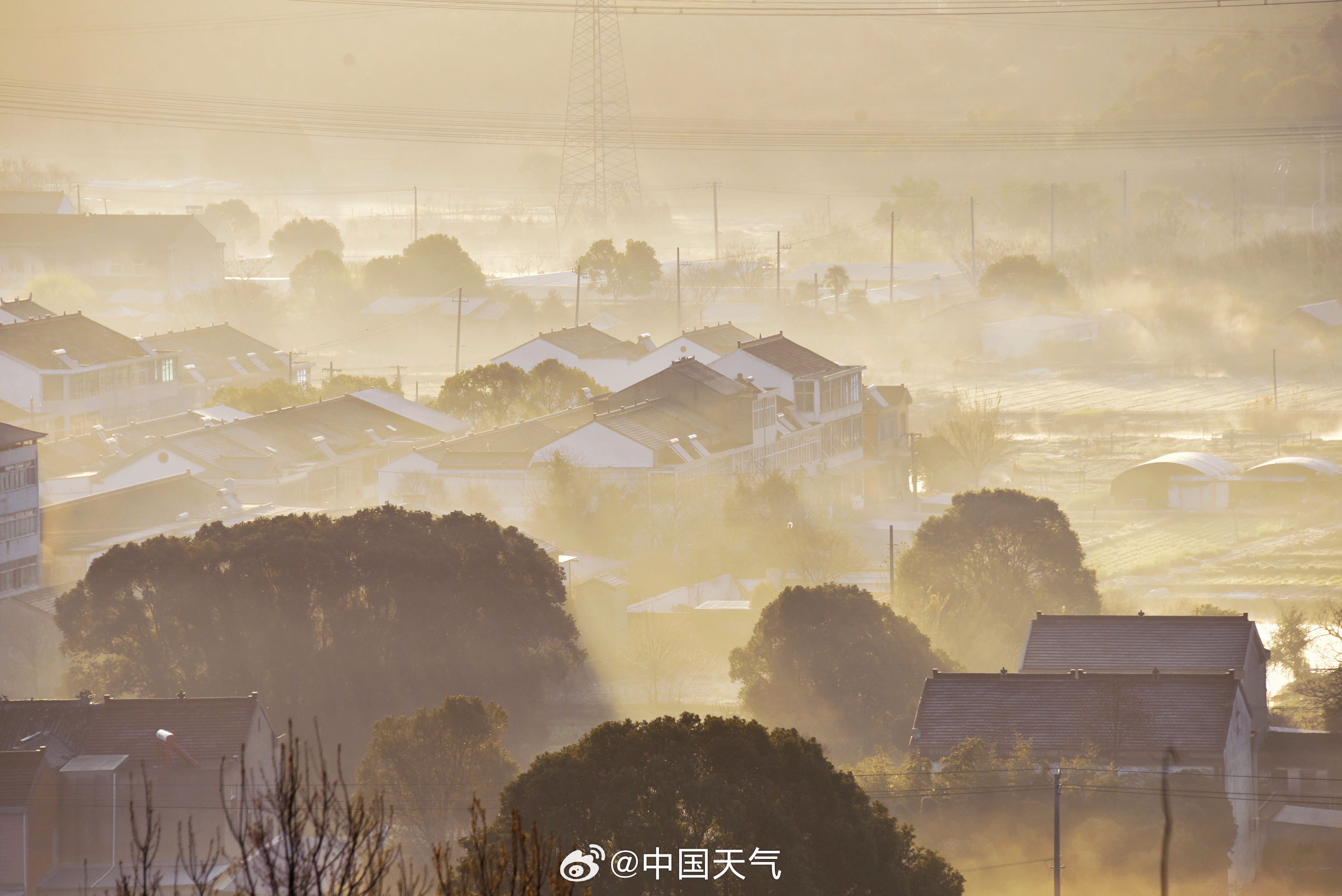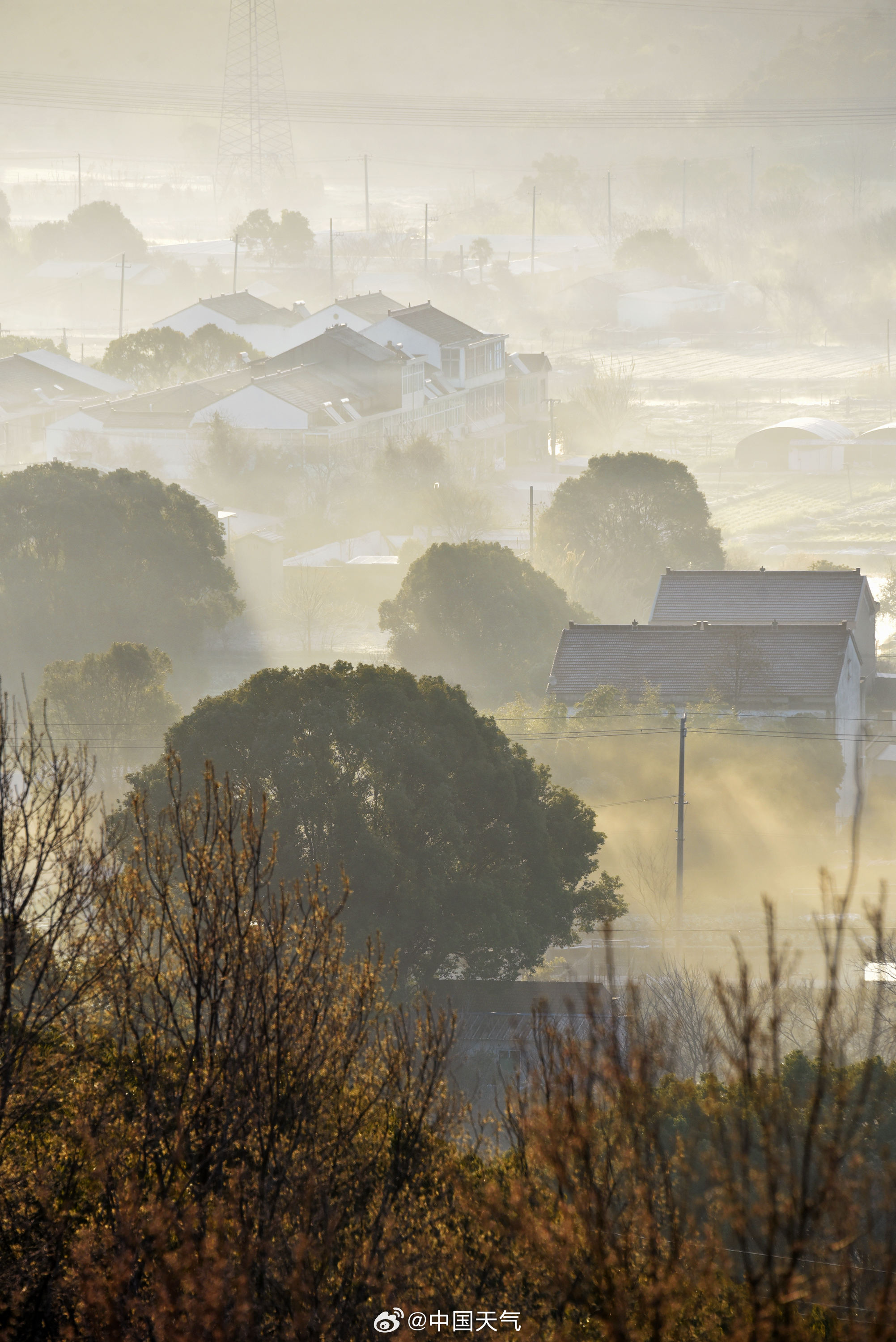 春日早晨,阳光透过轻雾,在丁达尔效应中,仿佛变成光瀑布,每一座村舍也仿佛披上了晨曦的温柔外衣,让人心生温暖与宁静。