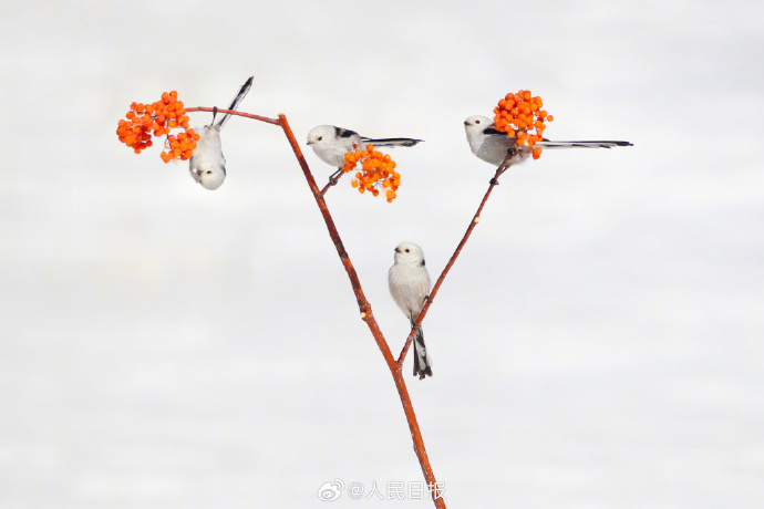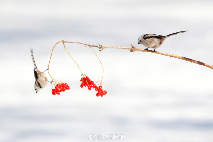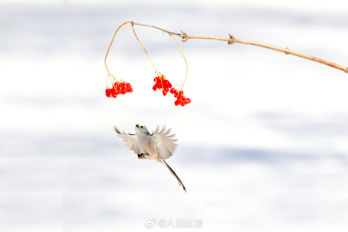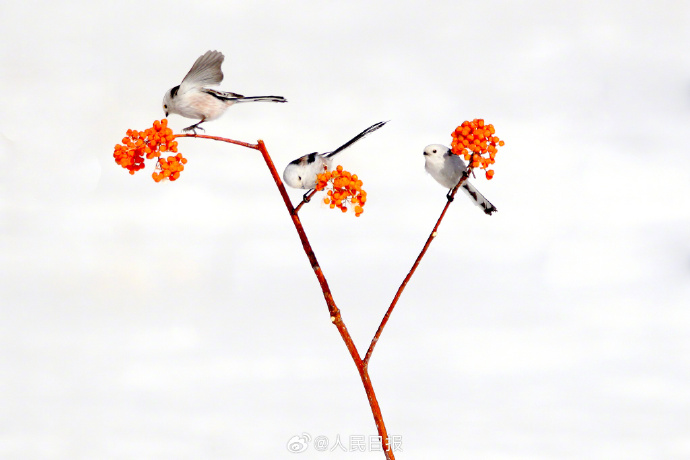 近日,黑龙江大庆城市森林公园雪地林间,小鸟在枝头嬉戏,画面灵动可爱。网友:好像是花鸟图照进了现实!