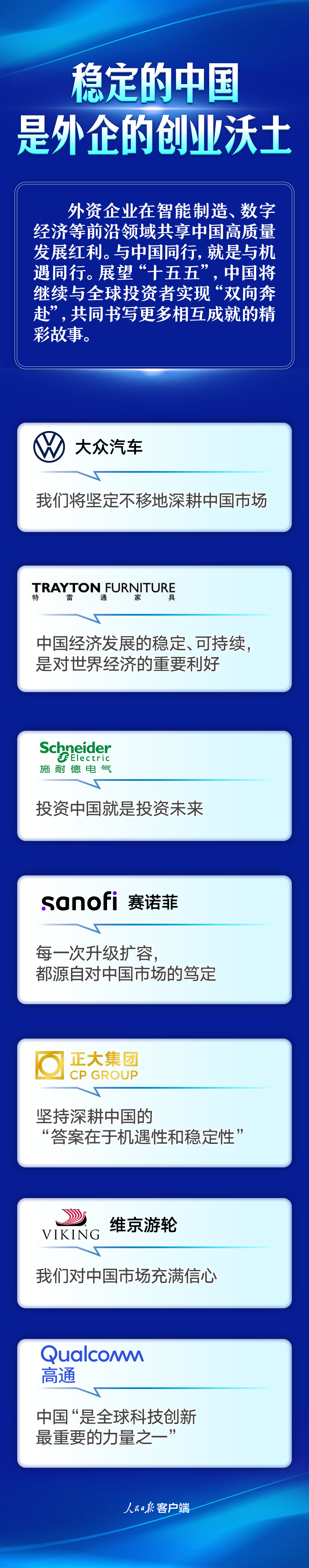 中国拥有全球最完备的产业体系、超大规模的市场优势以及向新向优发展的澎湃动能。外资企业在智能制造、数字经济等前沿领域共享中国高质量发展红利。与中国同行,就是与机遇同行。展望“十五五”,中国将继续与全球投资者实现“双向奔赴”,共同书写更多相互成就的精彩故事。