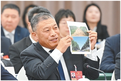 3月6日,辽宁代表团开放团组会议上,张德斌代表用照片展示乡村新变化。 |