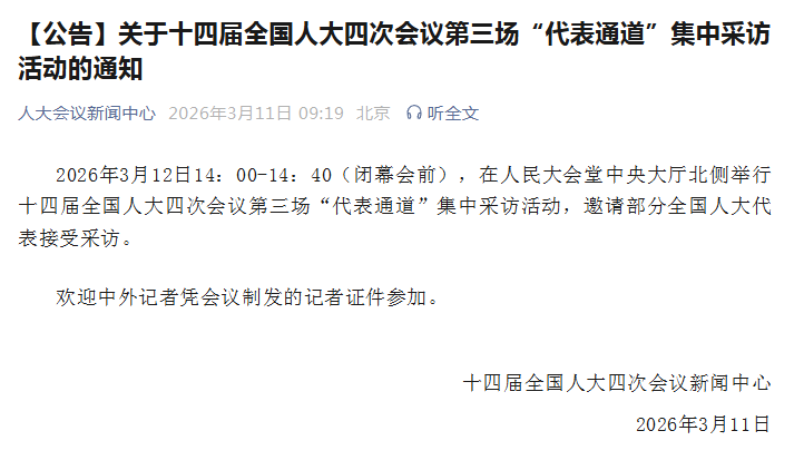 2026年3月12日14:00-14:40(闭幕会前),在人民大会堂中央大厅北侧举行十四届全国人大四次会议第三场“代表通道”集中采访活动,邀请部分全国人大代表接受采访。
