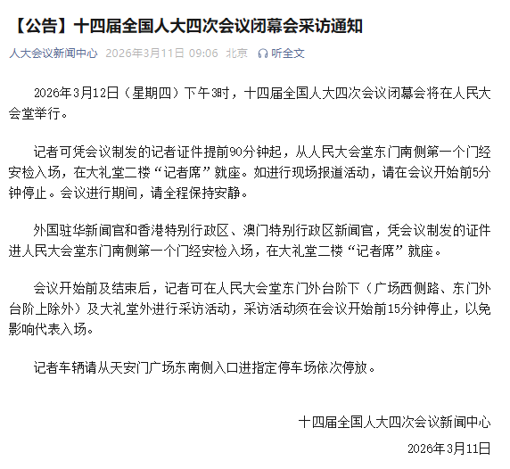 2026年3月12日(星期四)下午3时,十四届全国人大四次会议闭幕会将在人民大会堂举行。