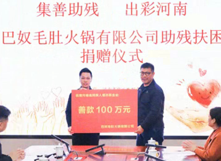 3月10日的捐赠仪式上,河南的企业巴奴毛肚火锅有限公司向河南省残疾人福利基金会捐赠100万元,专项用于关爱听障儿童。