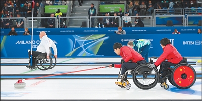中国队组合王蒙(右一)/杨金桥(右二)在米兰冬残奥会轮椅冰壶混合双打决赛中。 |