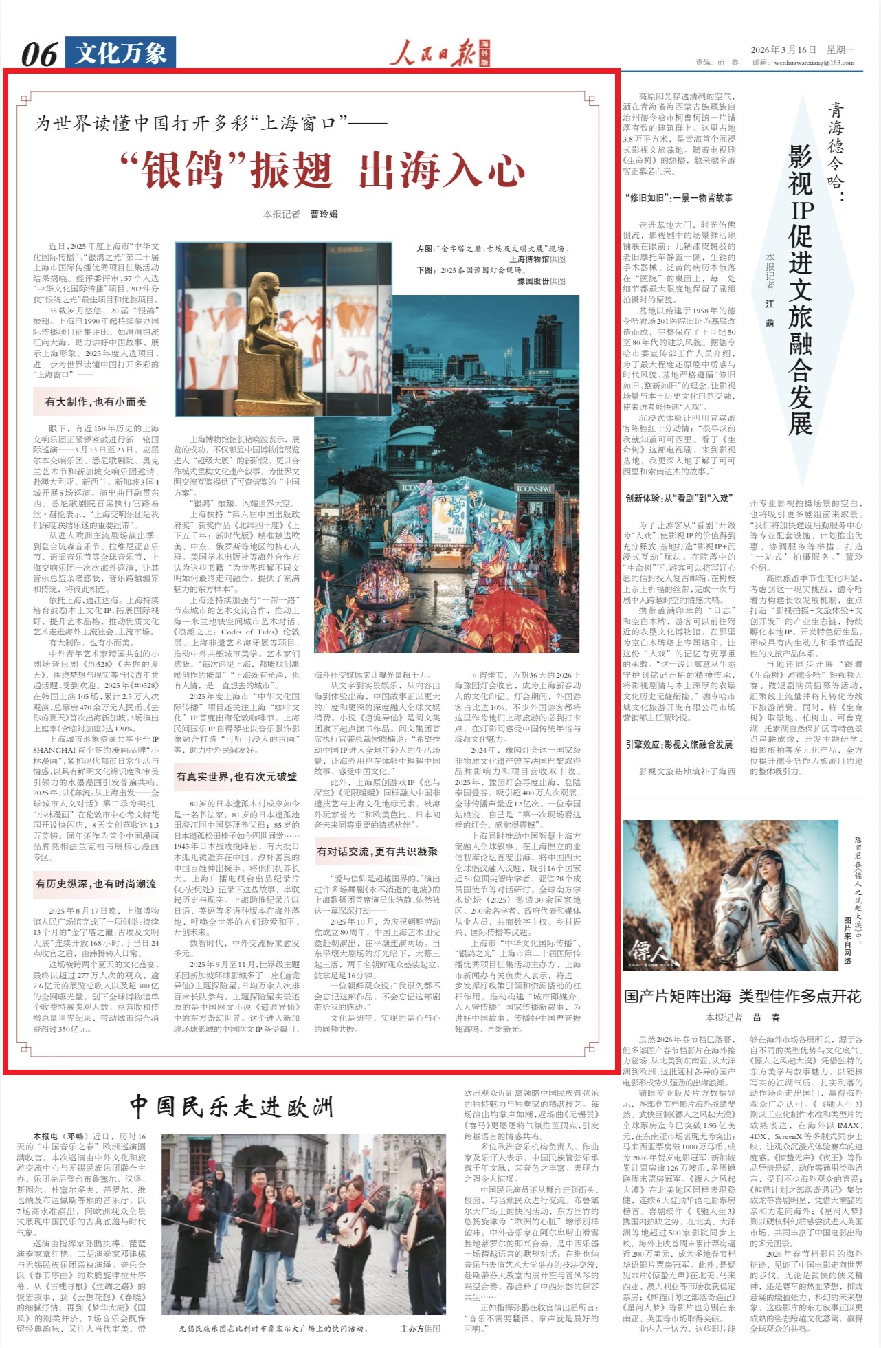 依托上海,通江达海。上海持续培育鼓励本土文化IP,拓展国际视野,提升艺术品格,推动优质文化艺术走进海外主流社会、主流市场。