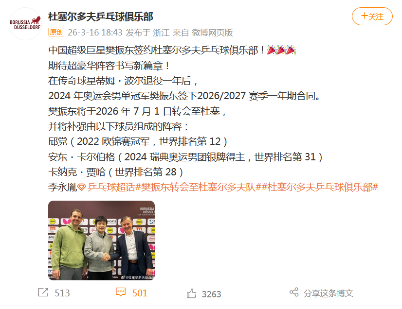 3月16日,杜塞尔多夫乒乓球俱乐部微博发布消息称,樊振东签约杜塞尔多夫乒乓球俱乐部。将于2026年7月1日转会。