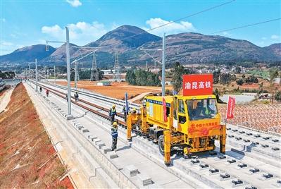 本报昆明3月19日电(记者叶传增)近日,在位于云南省昆明市嵩明县的渝昆高铁施工现场,随着第一对500米长钢轨稳稳落在无砟轨道上,渝昆高铁云南段正式开始铺轨。
