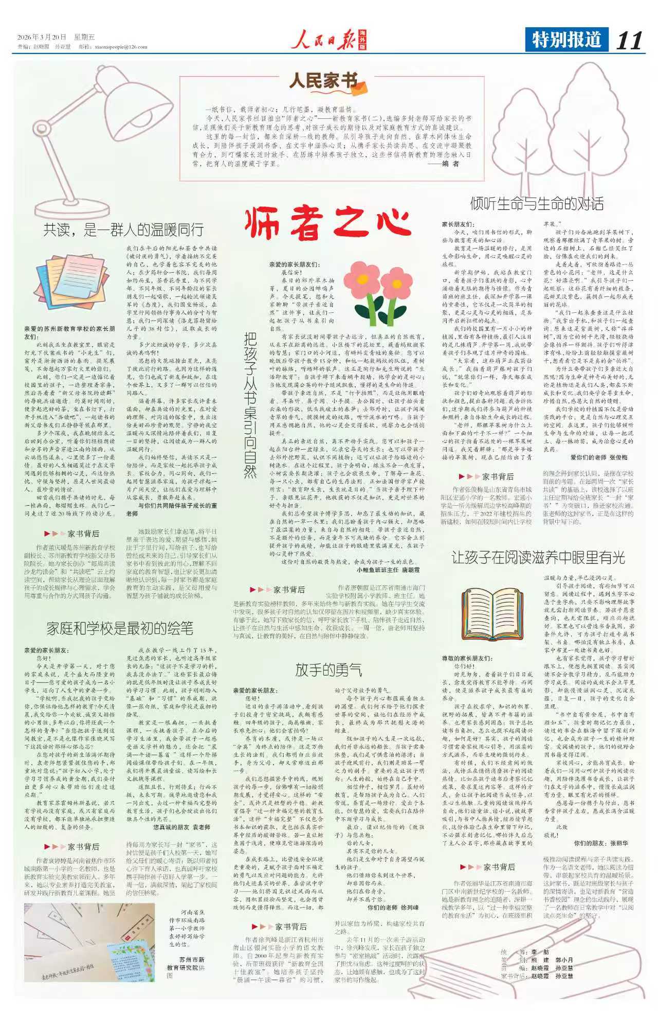 今天,人民家书栏目推出“师者之心”——新教育家书(二),选编多封老师写给家长的书信,呈现他们关于新教育理念的思考、对孩子成长的期待以及对家庭教育方式的真诚建议。