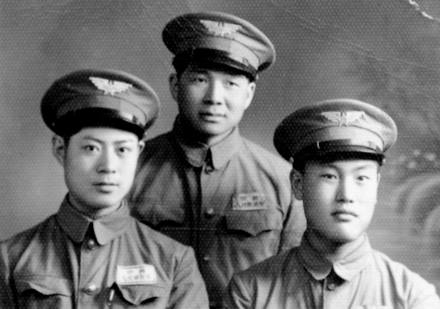 抗美援朝时期,担任空军第九师27团机械长的宋文骢(左二)