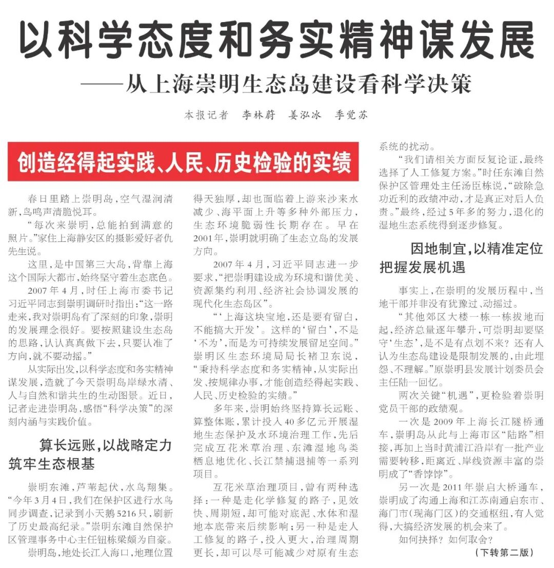 从实际出发,以科学态度和务实精神谋发展,造就了今天崇明岛岸绿水清、人与自然和谐共生的生动图景。近日,记者走进崇明岛,感悟“科学决策”的深刻内涵与实践价值。【点击阅读全文】