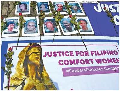 当地时间2025年8月14日,抗议者在菲律宾首都马尼拉罗哈斯大道旁竖立慰安妇雕像的旧址附近,展示慰安妇的标语和肖像。 |