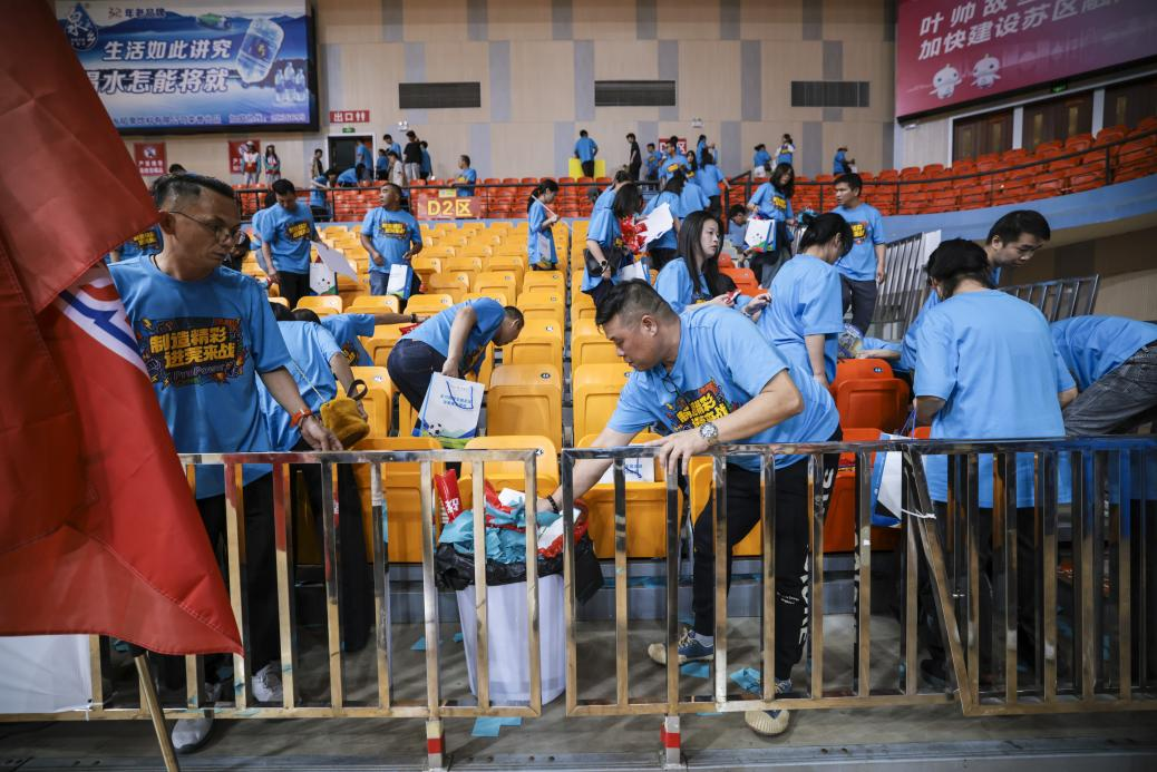 赛后,东莞队球迷自发在赛场清理垃圾。郑家雄摄